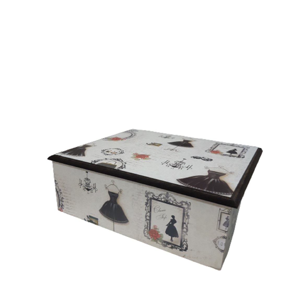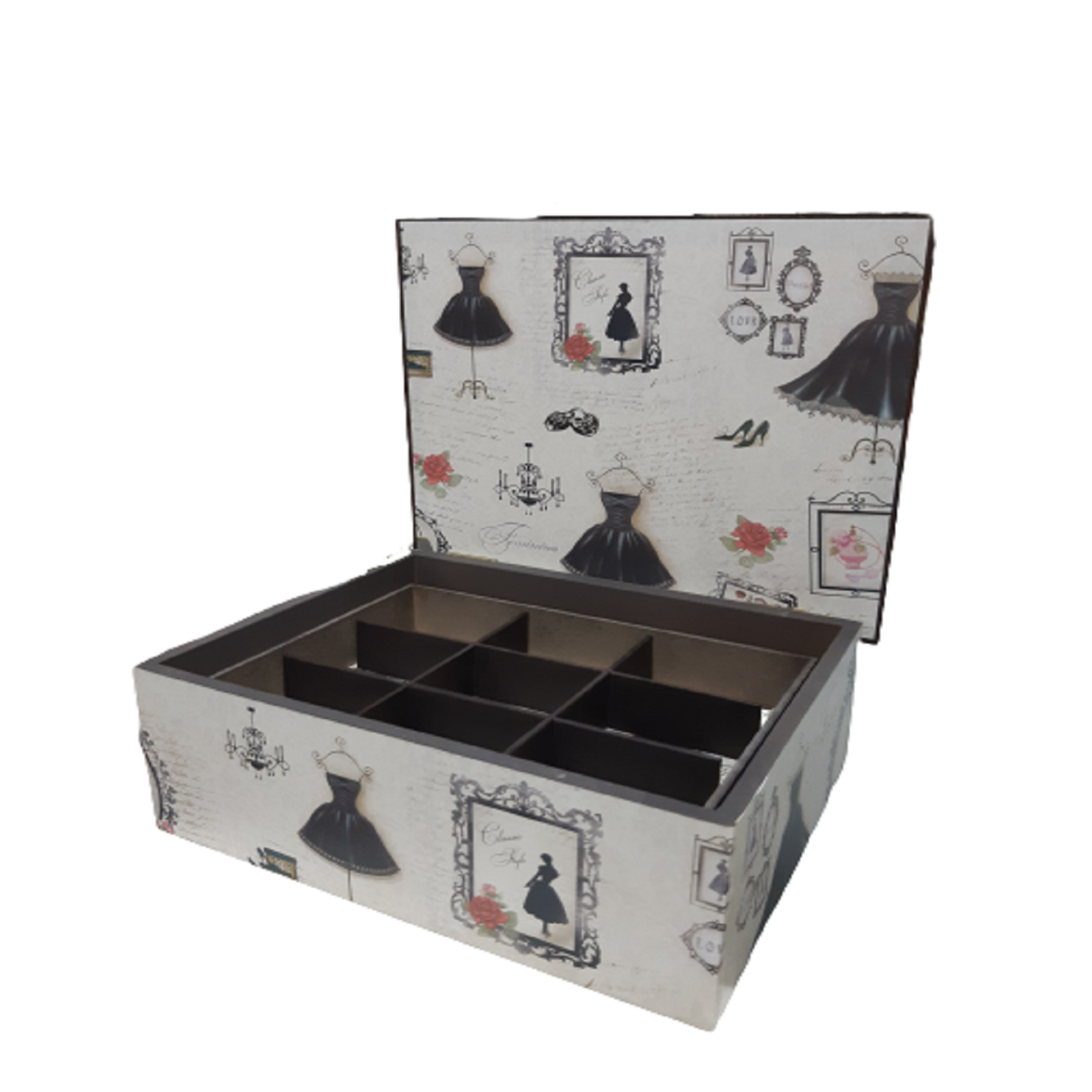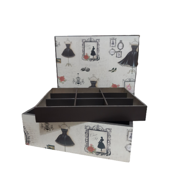 Confeccionado em MDF e revestido em estampa, contendo 2 andares, 1 bandejas e 1 fundo falso.