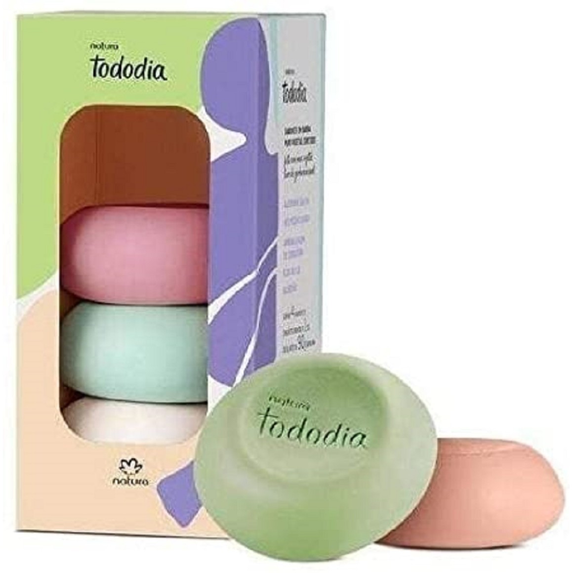 O Sabonete em Barra Tododia promove uma sensação agradável, limpa e deixa a pele macia e sedosa. Sua fórmula suave prepara a pele para receber a combinação nutritiva e inteligente dos hidratantes Natura Tododia. Contém 5 sabonetes (1 alecrim e sálvia, 1 noz pecã e cacau, 1 ameixa e flor de cerejeira - esfoliante, 1 flor de lis e 1 algodão) 90g cada.