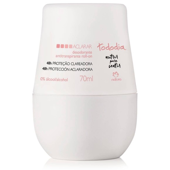 O Desodorante Antitranspirante Roll-on Tododia Aclarar foi desenvolvido para ajudar no processo natural de recuperação e uniformização da tonalidade da pele, mantendo suas axilas secas, protegidas e visivelmente mais claras em 30*. Sua fórmula conta com um complexo hidratante e extrato de calêndula. * Com o uso combinado do Desodorante Antitranspirante Roll-on Tododia Aclarar e do Desodorante Creme Noturno Tododia Aclarar.